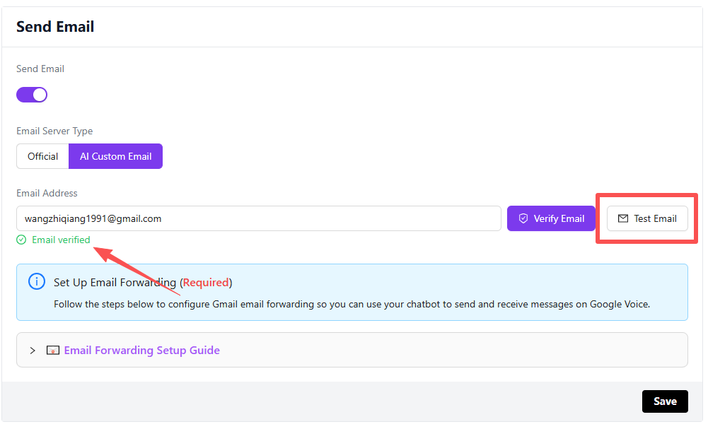 Test completed. You can now proceed to set up email forwarding. Please refer to the page documentation for details.